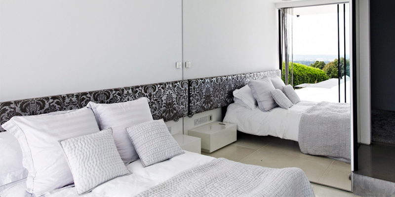 Simple, angular mirrors mounted on walls are the best way to master this illusion, as opposed to lots of little stand alone mirrors in the shape of a cactus or heaven knows what else. Think vast but minimal.
