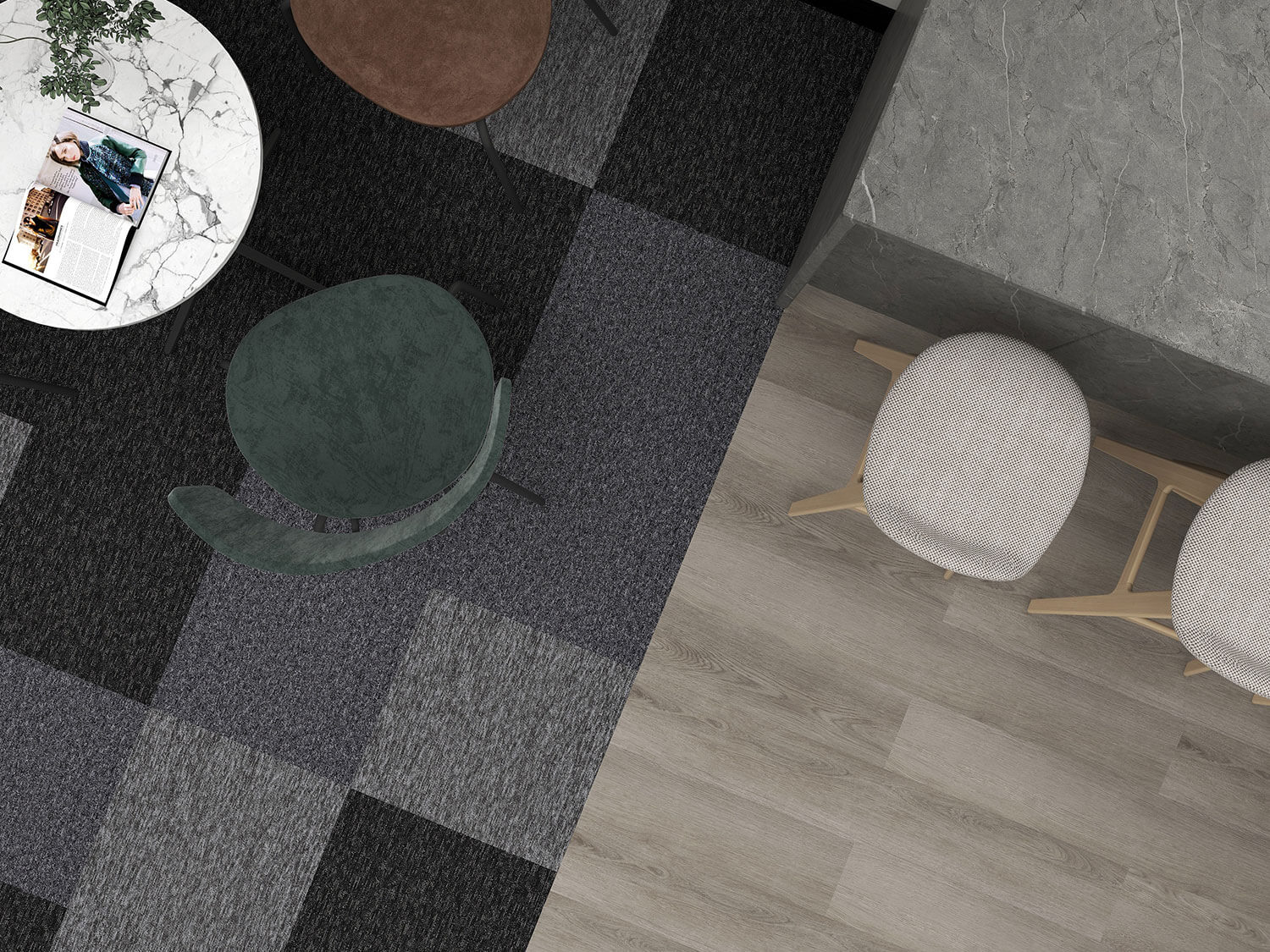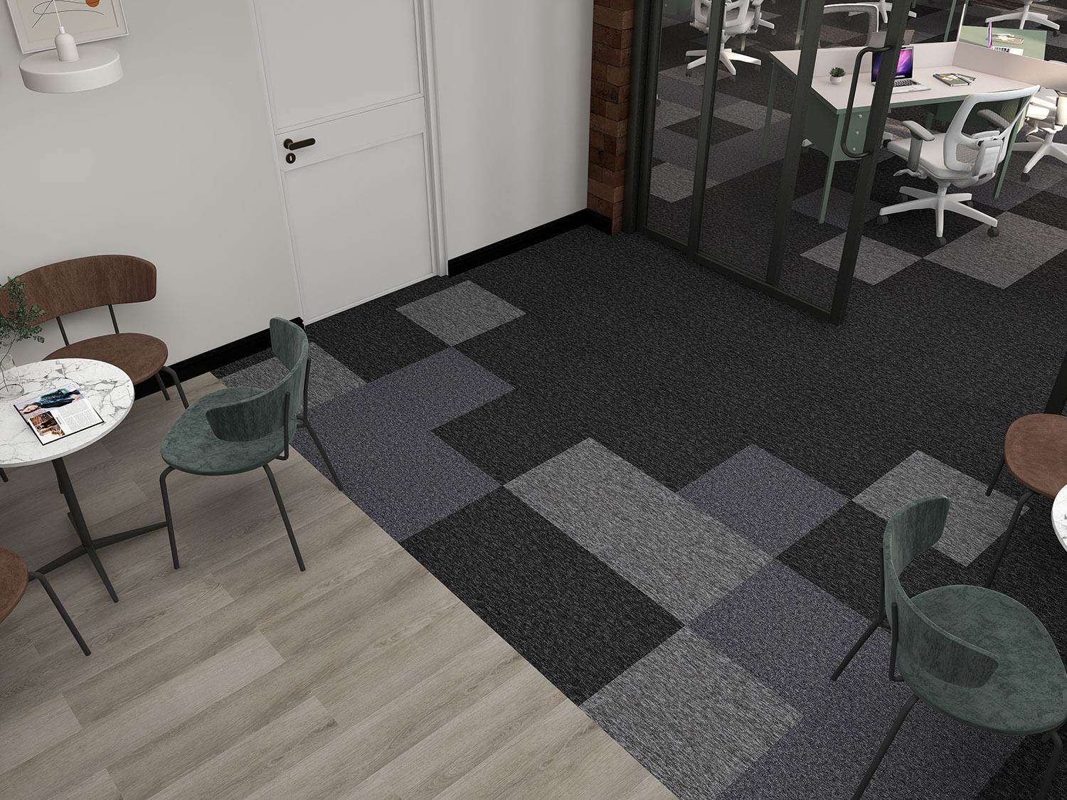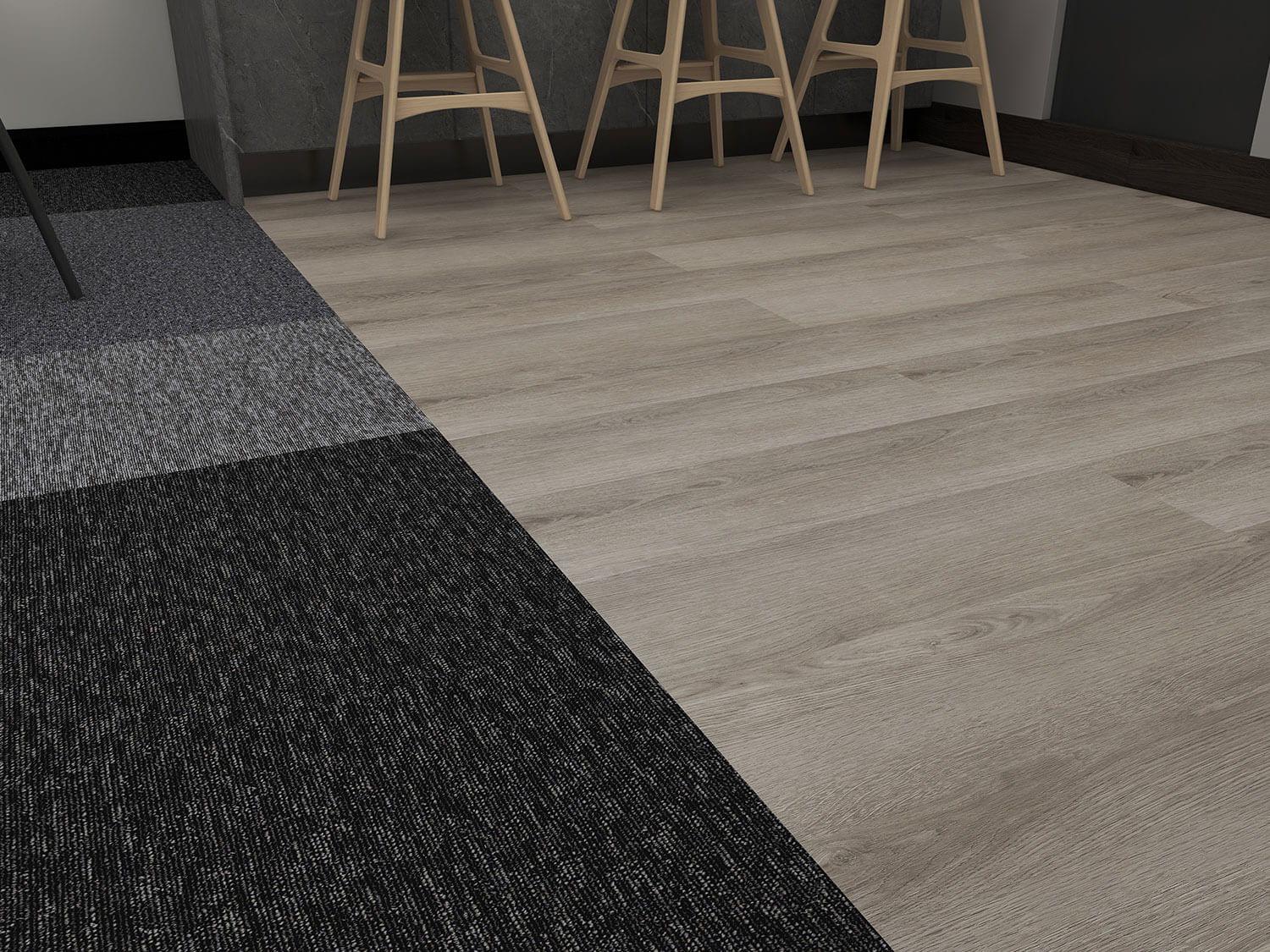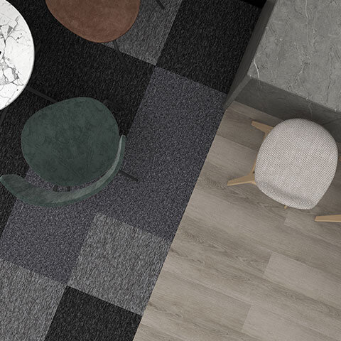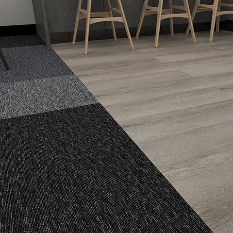 Discover "Boston Static," our exclusive flooring design for workplaces and offices, available at DCTUK. This innovative design combines the dynamic Nouveau Basics carpet tiles, reminiscent of TV static, with the elegant Gerflor Creation 40 Bostonian Oak Beige gluedown luxury vinyl tiles. The Nouveau Basics carpet tiles are not just visually striking with their unique speckled pattern but also boast practical features like stain resistance and durability, thanks to their 100% polypropylene construction. This makes them ideal for busy office environments where both style and functionality are key.