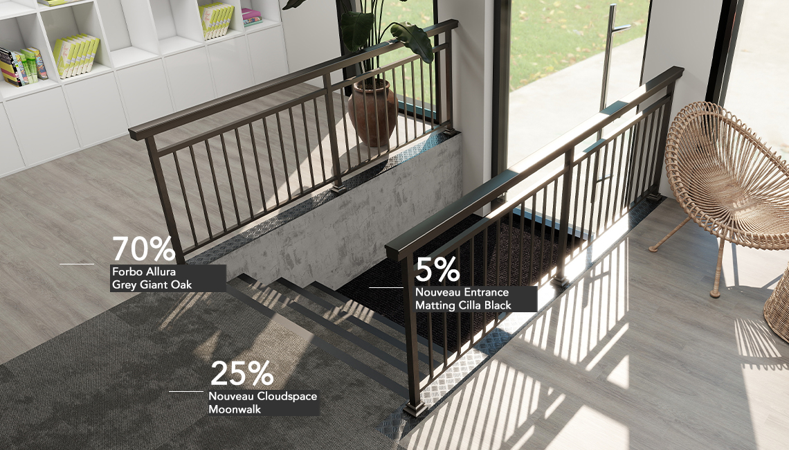 🌟 Step into the serene elegance of Ivory Coast, where the gentle cream hues and distressed patterns of Nouveau Cloudspace carpet tiles create a tranquil oasis for your floors. Paired with the sleek sophistication of Forbo Allura LVT and the practicality of Nouveau Entrance Matting, this premade flooring design combines style and functionality for a space that's both inviting and practical.