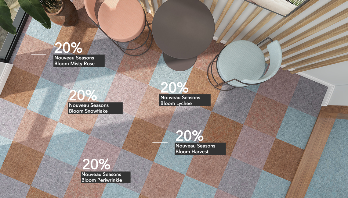 🌈 Dive into the dreamy world of Soft Tesserae, a pre-made flooring design that's as cozy as a pastel-hued daydream! Crafted from the enchanting Nouveau Seasons Bloom carpet tiles, Soft Tesserae brings a burst of pale pastel colors, including shades of pink, lilac, sky blue, and orange, creating a soft and playful tapestry for your floors. It's not just flooring; it's a canvas of joy underfoot.