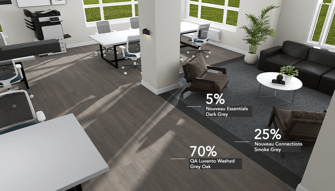 🌲 Embrace the warmth of Timbered Grey, a flooring masterpiece that marries the timeless elegance of Nouveau Essentials and Nouveau Connections carpet tiles with the rustic charm of QA Luvanto Gluedown LVT. Picture a forest retreat in soft greys – that's the vibe Timbered Grey brings to your space, creating a cozy haven with a touch of modern flair.