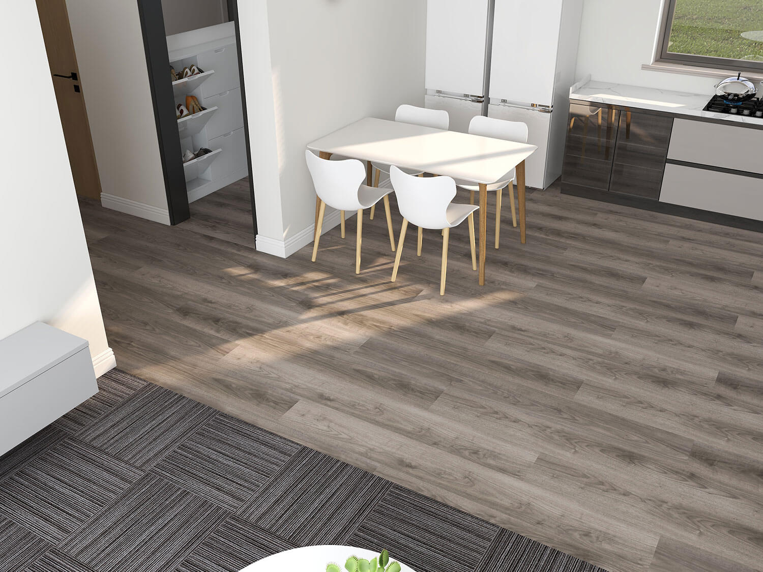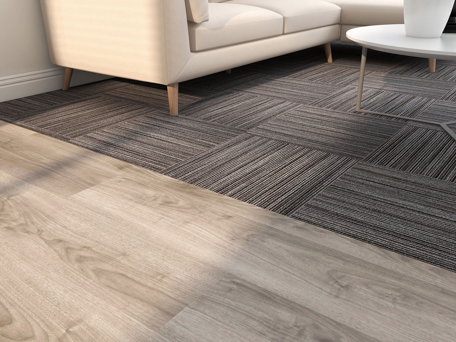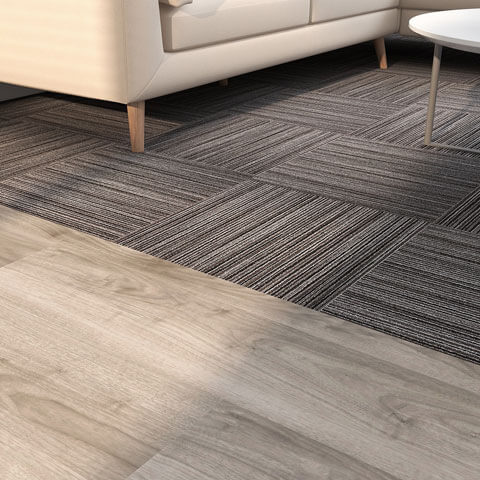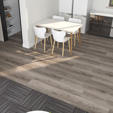 Say hello to "White Autumn Lead," our snazzy and sleek flooring design that's perfect for sprucing up modern office spaces, from buzzing breakout areas to welcoming reception zones. This design is a playful mix of robust Nouveau Endurance Heavy Lead carpet tiles (they're tough cookies but with style!) and the oh-so-chic Forbo Allura Dryback White Autumn Oak luxury vinyl planks. It's like the power couple of flooring – strong and stunning!