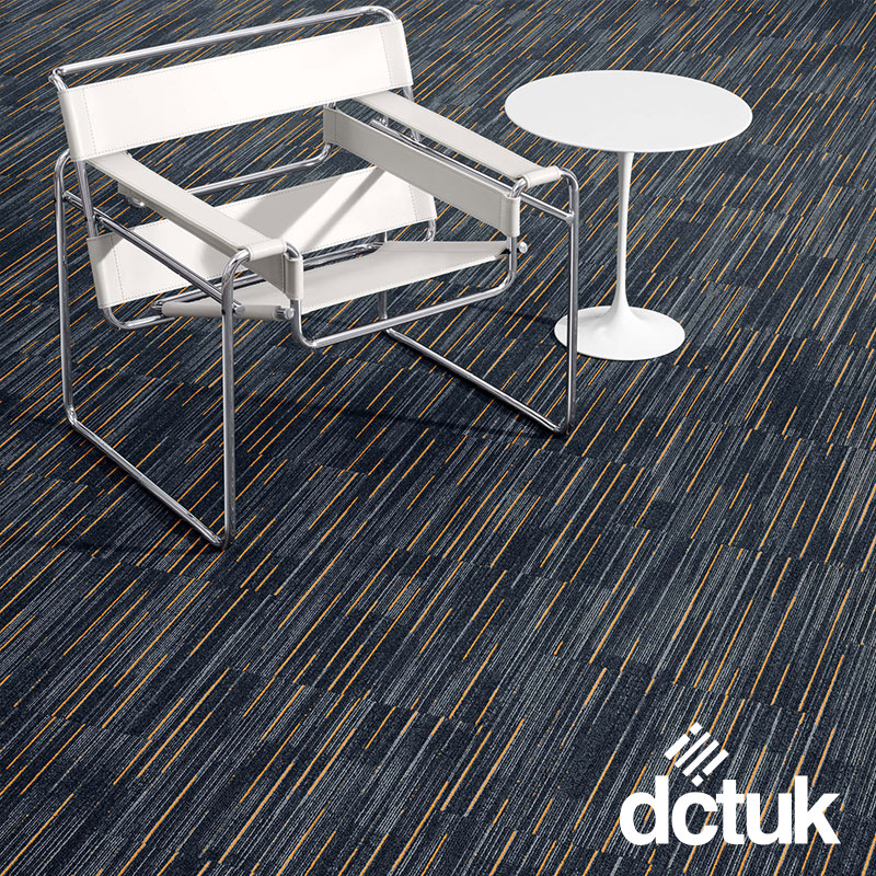 Milliken Light Trails Night takes its linear pattern from the light cutting through the darkness of a night sky, punctuated rows of vivid colour beam across the carpet tile.