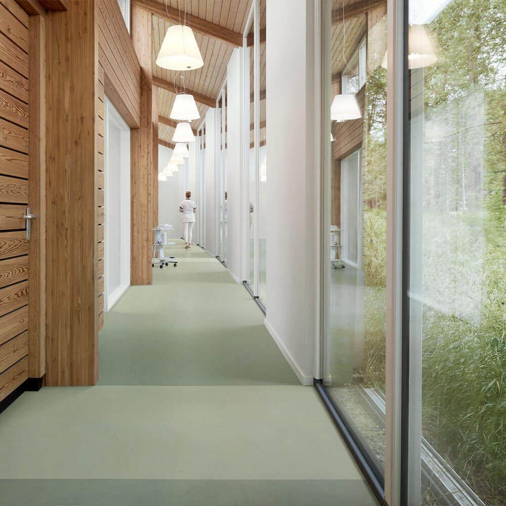 Marmoleum Modular tiles from Forbo are made up of recycled content, and manufactured in a factory powered by 100% renewable sources. The material is cigarette resistant, resistant to acids, oils, fats and most solvents as well as per perfectly suited to castor chair usage.