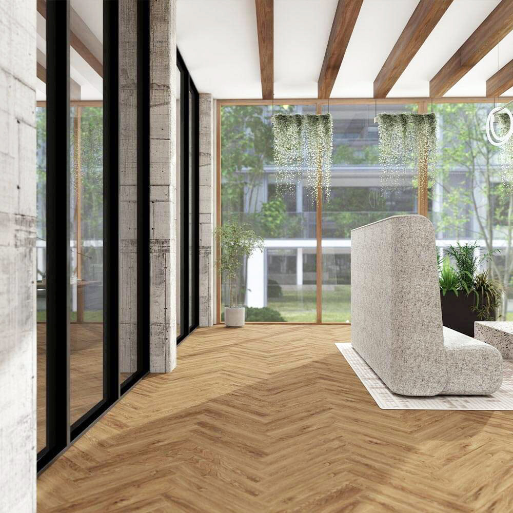 Choose Dryback 55 Herringbone to achieve the refined marquetry effect of traditional wood, backed by the strength and technical specifications required for modern commercial use.