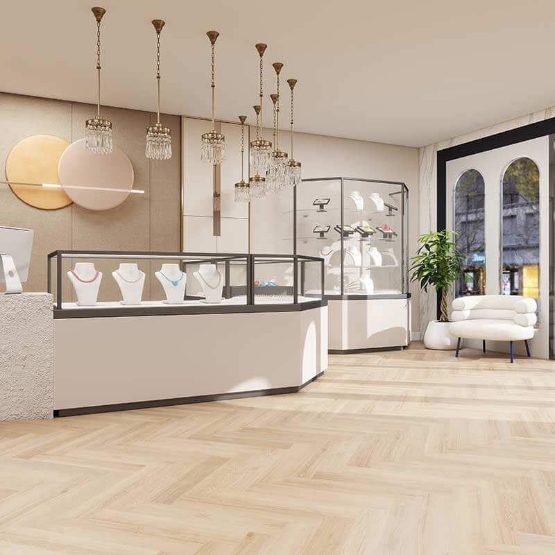Ideal for commercial spaces, this luxury vinyl tile (LVT) flooring is both stylish and robust. The herringbone pattern adds a sophisticated touch to any room.