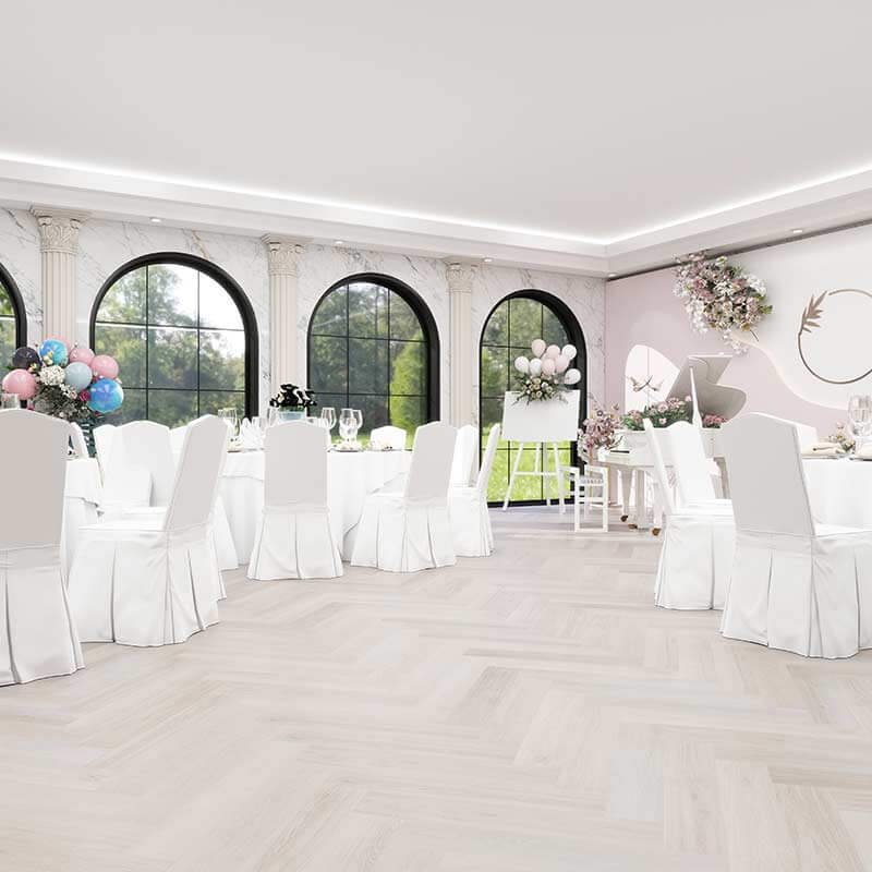 This luxury vinyl tile (LVT) flooring is perfect for commercial spaces needing a blend of durability and sophistication. The herringbone pattern adds a touch of elegance to any room.