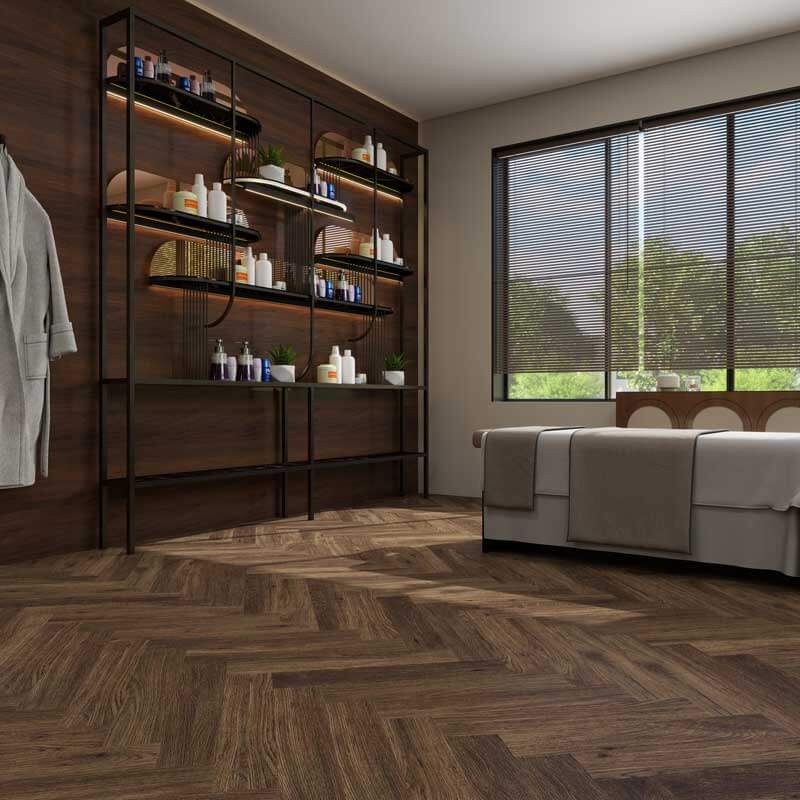 This luxury vinyl tile (LVT) flooring is ideal for commercial spaces craving a blend of sophistication and toughness. The herringbone pattern adds a touch of timeless class to any room.