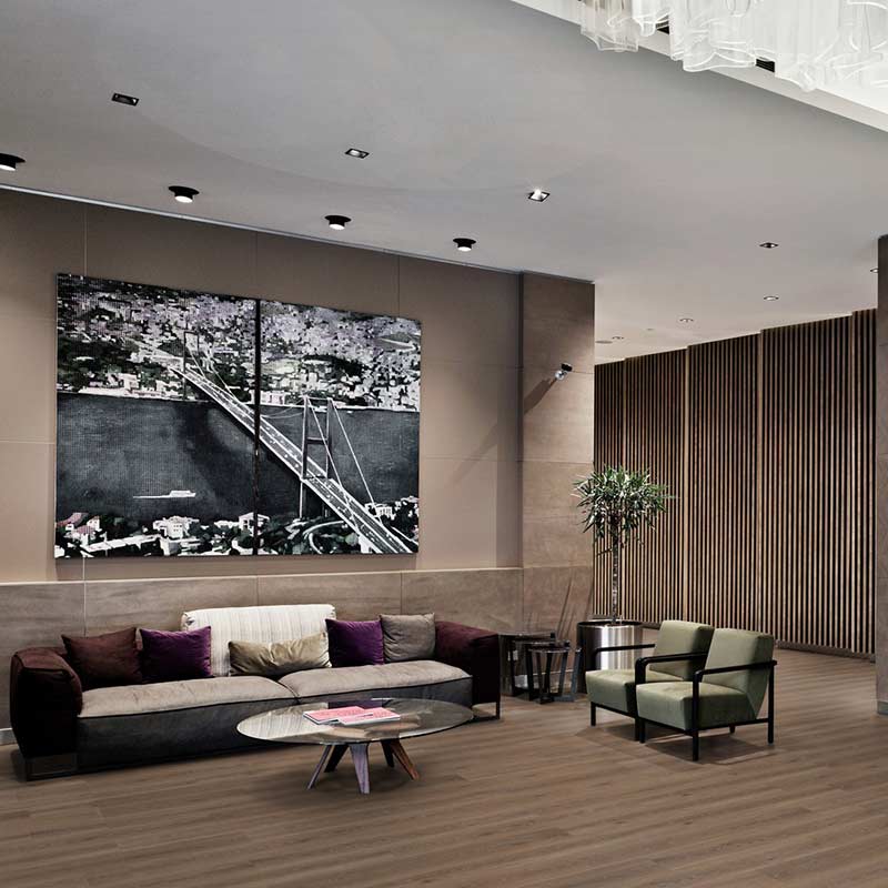 Ready to give your hotel lobby the red carpet treatment without the actual red carpet? Tribe Oak Mocha from Tarkett Essence 55 luxury vinyl is the way to go! Perfect for offices, retail stores, and hotel lobbies where first impressions matter. 🏨✨