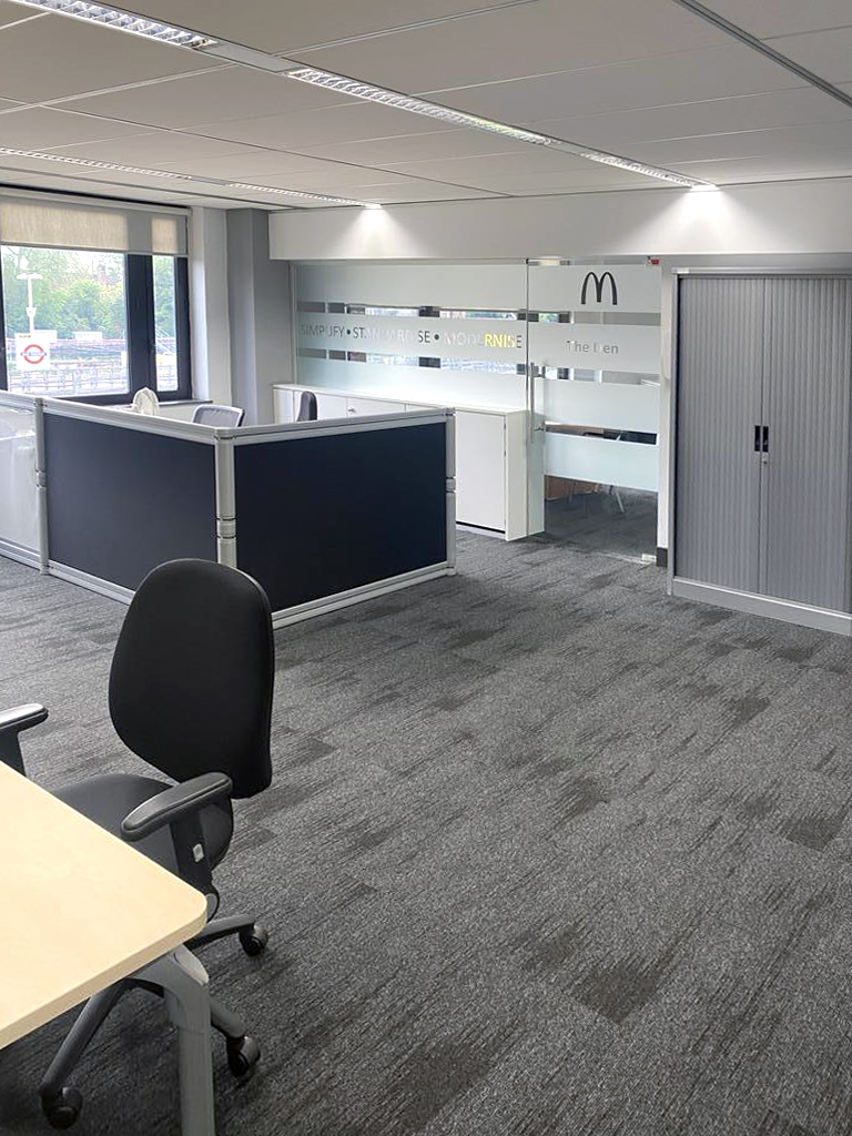 We recently completed a flooring installation at the McDonald's office in London, enhancing their workspace with our top-quality products. Our team installed Desso Essence Structure carpet tiles in the sophisticated colour 9502, covering the office area with a modern and durable flooring solution.