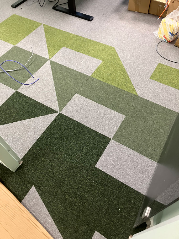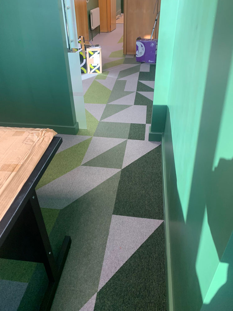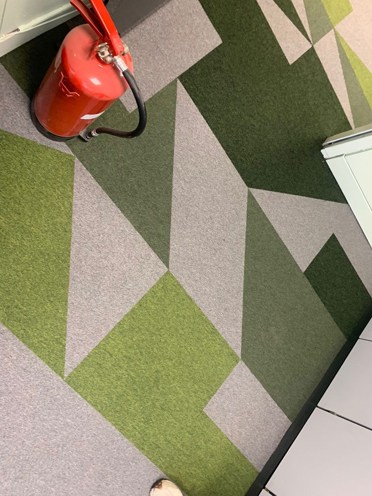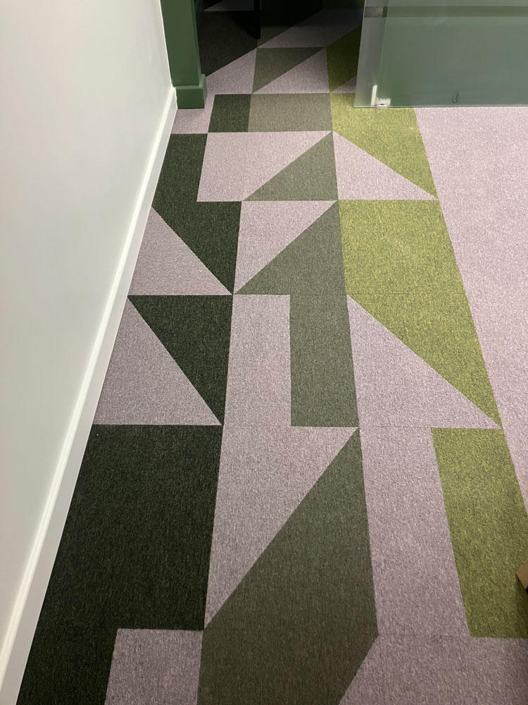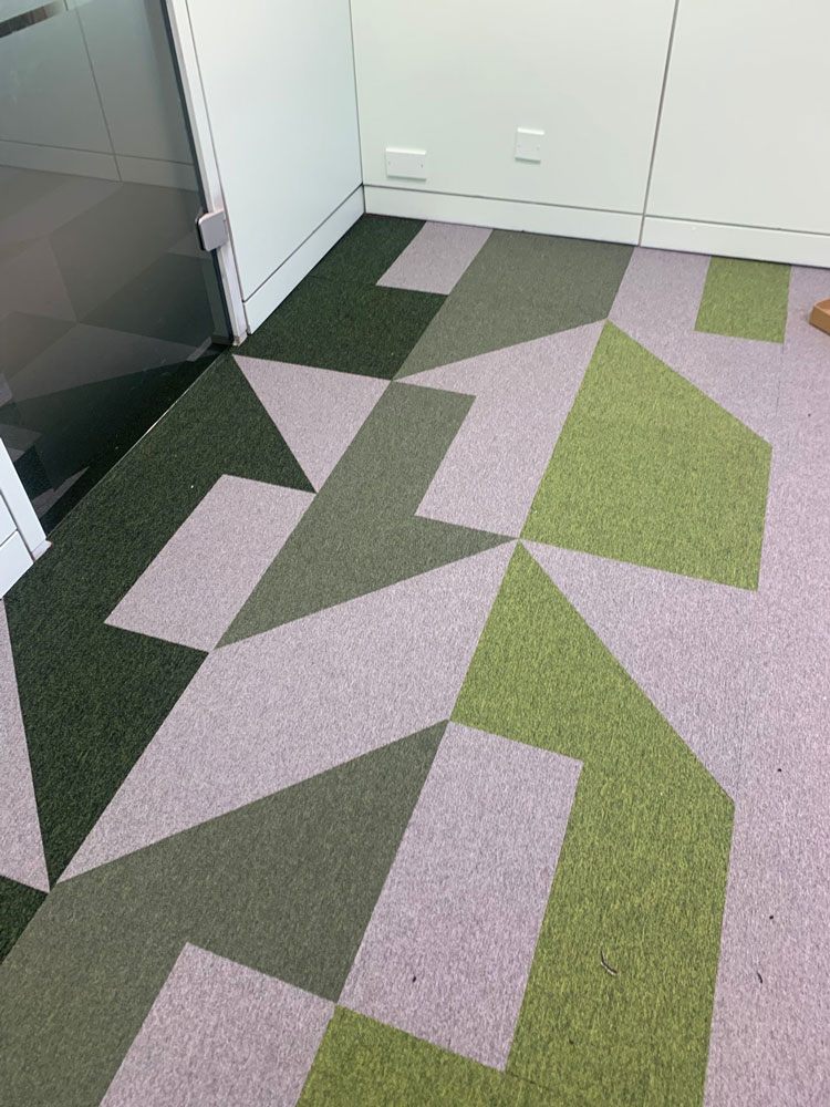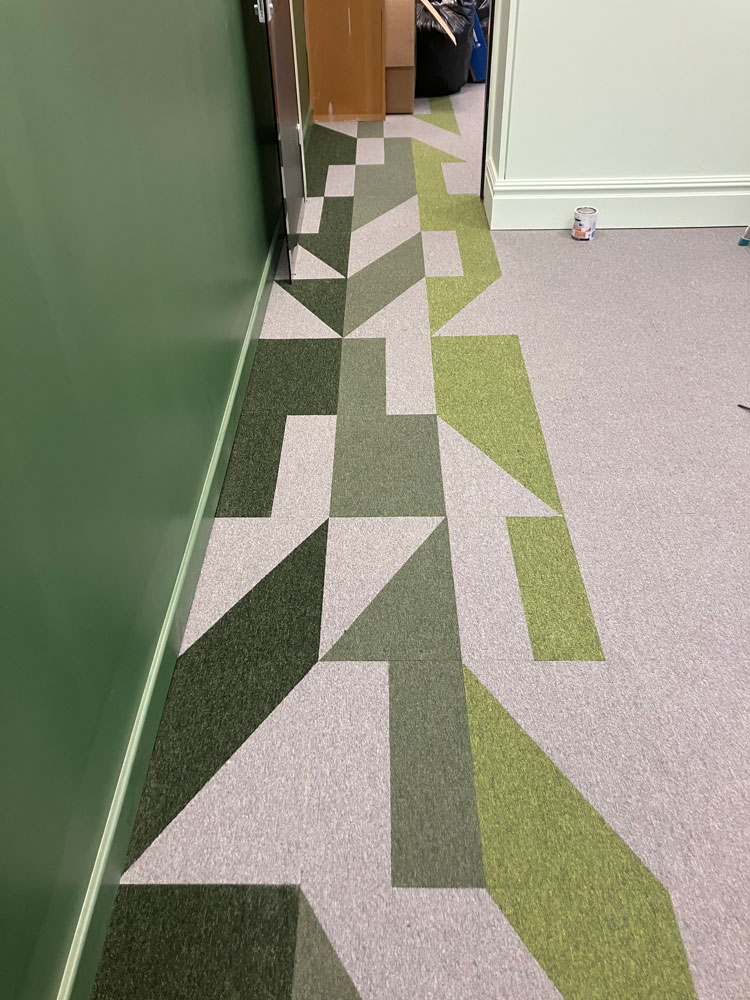 We recently completed a flooring installation at an office space in London, where our team expertly fitted over 200 square metres of Mohawk Group's Art Intervention Creative Spark carpet tiles. The client selected a sophisticated palette featuring main grey and three different green hues, resulting in an intricate design that our fitting team brought to life with exceptional precision.